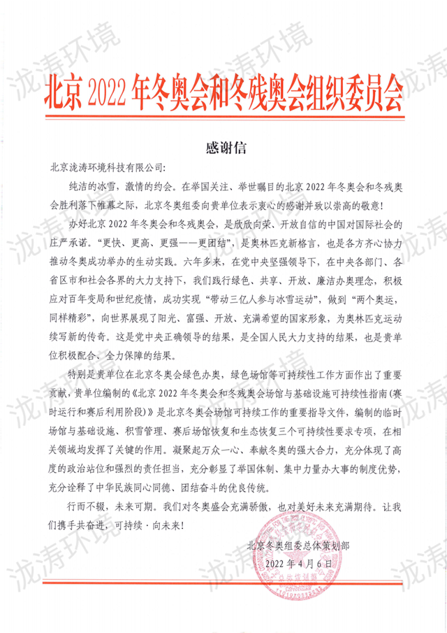 北京2022年冬奧會和冬殘奧會圓滿落幕,純潔的冰雪、激情的約會再次生動詮釋了奧林匹克運動精神,也為“綠色辦奧”理念提供了國際范本。北京瀧濤環(huán)境科技有限公司作為生態(tài)環(huán)境綜合服務(wù)供應(yīng)商,很榮幸有機會深度參與2022年冬季奧運會,賦能綠色奧運,收獲了來自北京冬奧組委總體策劃部的感謝...