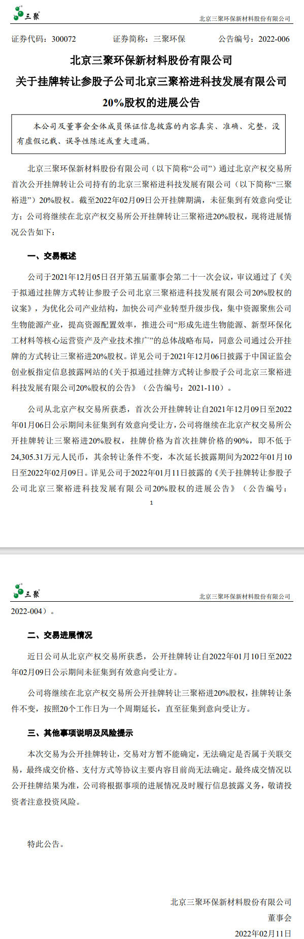 2022年2月11日,北京三聚環(huán)保新材料股份有限公司發(fā)布《關(guān)于掛牌轉(zhuǎn)讓參股子公司北京三聚裕進(jìn)科技發(fā)展有限公司20%股權(quán)的進(jìn)展公告》。 公告顯示,自2021年12月09日,截至2022年02月09日公開掛牌期滿,參股子公司北京三聚裕進(jìn)科技發(fā)展有限公司20%股權(quán)在北京產(chǎn)權(quán)交易所公開掛牌未征集到有效意向受...