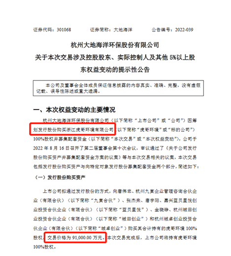 生活垃圾分類回收“藍?!闭絹碓蕉嘤袑嵙Φ墓靖傊?。8月17日,大地海洋(301068.SZ)披露重大資產(chǎn)重組草案,公司擬通過發(fā)行股份的方式,向唐偉忠、九寅合伙、張杰來、唐宇陽、藍貝星悅、金曉錚、城田創(chuàng)業(yè)和城卓創(chuàng)業(yè)購買其合計持有的虎哥環(huán)境100%股權(quán),交易價格為9.1億元;同時擬向合計不超過35...