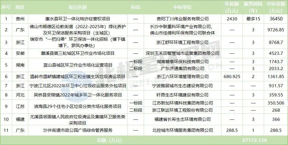 詳情如下:項目名稱:貴州省惠水縣環(huán)衛(wèi)一體化特許經(jīng)營權(quán)項目中標(biāo)單位:貴陽丁川偉業(yè)服務(wù)有限公司中標(biāo)金額:2430萬元/年,最高36450萬元服務(wù)時間:8+N(N最少不低于2年,最高不超過7年)服務(wù)內(nèi)容:特許經(jīng)營范圍包括約291萬平方米的城市各級道路及好花紅景區(qū)的日常清掃保潔,9個轉(zhuǎn)運站的維護管理,城市建...