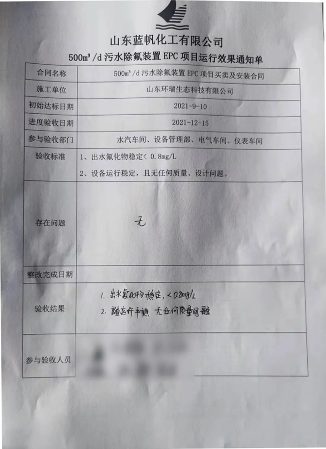 2021年12月15日,環(huán)瑞生態(tài)深度除氟<0.8mg/L項目——《藍帆化工煤造氣廢水深度除氟項目》順利通過竣工驗收! 項目運行效果通知單 經(jīng)過三個月的艱苦奮戰(zhàn),順利完工驗收,系統(tǒng)連續(xù)運行三個月出水完全達標(biāo),出水氟離子濃度穩(wěn)定<0.8mg/L,且無裝置設(shè)備運行質(zhì)量問...