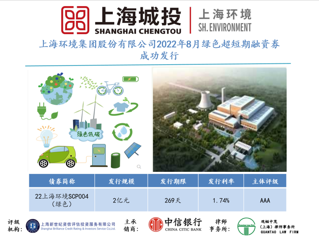 文章導(dǎo)讀8月30日,上海環(huán)境集團(tuán)股份有限公司成功發(fā)行22上海環(huán)境SCP004(綠色),融資規(guī)模2億元,期限269天,用于滿足下屬子公司日常運(yùn)營(yíng)的資金需求。本次發(fā)行綠色超短融最終票面利率為年化1.74%。上海環(huán)境通過積極響應(yīng)綠色金融活動(dòng),參與經(jīng)濟(jì)社會(huì)綠色低碳轉(zhuǎn)型,助力“碳達(dá)峰”、“碳中和”。2021年...