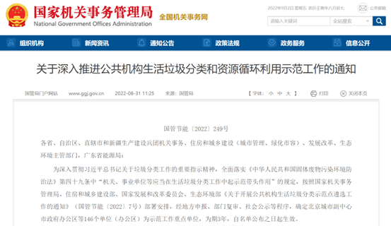 關(guān)于深入推進(jìn)公共機(jī)構(gòu)生活垃圾分類和資源循環(huán)利用示范工作的通知國(guó)管節(jié)能〔2022〕249號(hào)各省、自治區(qū)、直轄市和新疆生產(chǎn)建設(shè)兵團(tuán)機(jī)關(guān)事務(wù)、住房和城鄉(xiāng)建設(shè)(城市管理、綠化市容)、發(fā)展改革、生態(tài)環(huán)境主管部門,廣東省能源局:為深入貫徹習(xí)近平總書記關(guān)于垃圾分類工作的重要指示精神,全面落實(shí)《中華人民共和國(guó)固體廢...