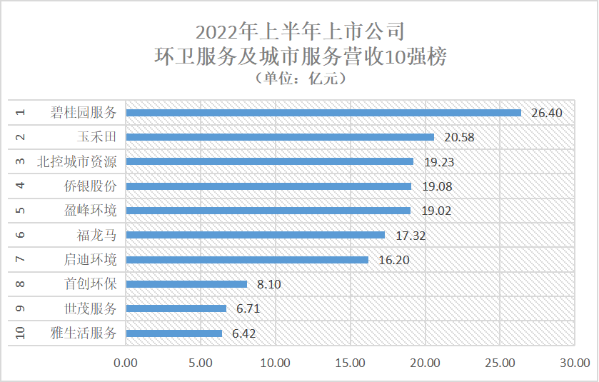 保利物業(yè)、恒大物業(yè)、建業(yè)新生活、金科服務(wù)、粵豐環(huán)保、招商積余、中創(chuàng)環(huán)保、旺能環(huán)境、光大環(huán)境、博世科、城發(fā)環(huán)境等11家上市公司未公布上半年“環(huán)衛(wèi)服務(wù)”或“城市服務(wù)”營(yíng)收數(shù)據(jù)。其中,碧桂園服務(wù)、玉禾田、北控城市資源、僑銀股份、盈峰環(huán)境、福龍馬、啟迪環(huán)境、首創(chuàng)環(huán)保、世茂服務(wù)、雅生活服務(wù)等10家上市公司進(jìn)入...