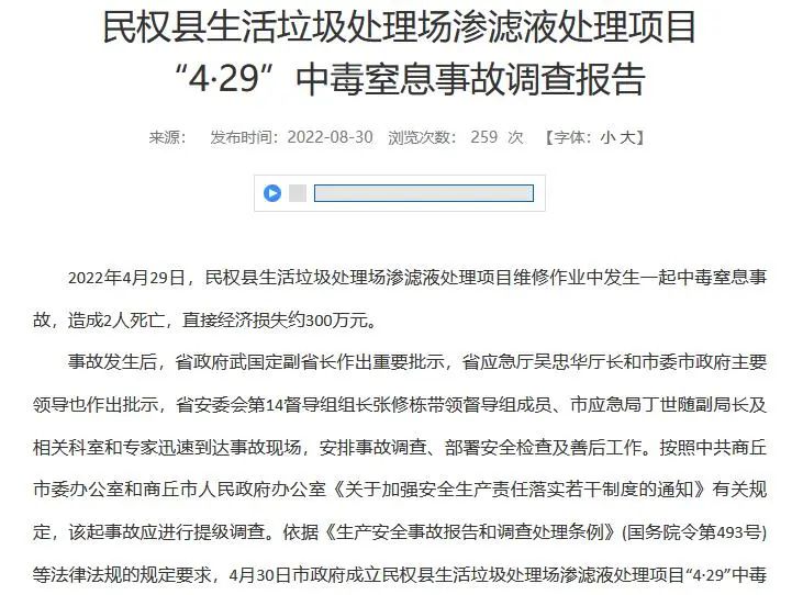 2022年4月29日,民權(quán)縣生活垃圾處理場(chǎng)滲濾液處理項(xiàng)目維修作業(yè)中發(fā)生一起中毒窒息事故,造成2人死亡,直接經(jīng)濟(jì)損失約300萬元。民權(quán)縣生活垃圾處理場(chǎng)滲濾液處理項(xiàng)目“4·29”中毒窒息事故調(diào)查報(bào)告2022年4月29日,民權(quán)縣生活垃圾處理場(chǎng)滲濾液處理項(xiàng)目維修作業(yè)中發(fā)生一起中毒窒息事故,造成2人死亡,直接...