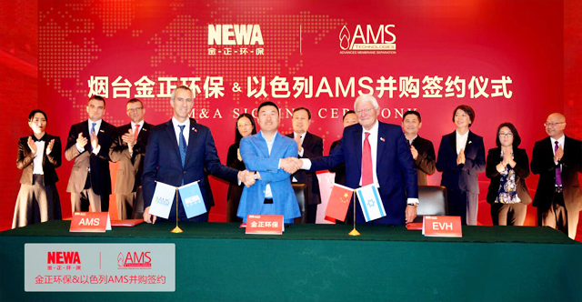 儀式上,在煙臺(tái)市政府領(lǐng)導(dǎo)、煙臺(tái)市環(huán)保局領(lǐng)導(dǎo)、煙臺(tái)市萊山區(qū)領(lǐng)導(dǎo)及長(zhǎng)期以來(lái)支持金正環(huán)保的金融界等合作伙伴共同見(jiàn)證下金正環(huán)??偛美钤奖胂壬MS公司原股東Johannes Sittard博士以及AMS公司CEO Gil Meron成功簽訂并購(gòu)協(xié)議。