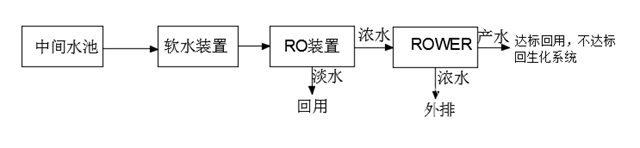 經(jīng)反滲透處理的濃水,利用離心泵把水打到ROWER膜堆中,在膜堆中通直流電源,利用膜的選擇透過性,使原水中的離子遷移到ROWER濃水中,達(dá)到除鹽的目的,ROWER產(chǎn)生的淡水若能滿足系統(tǒng)沖洗回用水的需要,則利用;否則進(jìn)一步回到生化系統(tǒng)中,繼續(xù)進(jìn)一步降低COD,從而進(jìn)一步提高回用水的利用率。