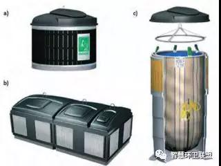為了進行廢物的投放,產業(yè)所有者或物業(yè)管理公司應當為住宅提供生活垃圾的投放點。投放時采用的容器分為普通容器(更為常用)和埋入式容器(正在普及)兩種。常用的普通投放容器分別為140升(圖8中c)、240升(圖8中b)、600升(圖8中a)這三種。普通投放容器的缺點是,雖然容積不大,但卻會占據將對較大的空間。埋入式容器部分設置于地下,內部配備高強度織物容納袋,容納能力遠高于普通容器,能夠在節(jié)省空間的同時,起到降低收運頻次的作用。收運時,收運車輛會將織物袋從容器中取出,通過打開袋底的機關清空廢物。