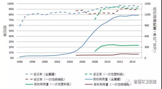 芬蘭的押金體系實現了極高的回收率。在PALPA體系剛剛成立的1996年,一次性金屬罐的回收率就已經達到了59%,并馬上于第二年上升到了79%。到了2009年,金屬罐的回收率已經超過90%。同樣地,PET瓶的押金體系在2008年開始實施時,返還率就已經達到了71%,之后在兩年內便上升到了90%以上。玻璃瓶在芬蘭擁有很長的押金制度實施積累,因此在PALPA在建立針對玻璃瓶的回收體系后,回收率就一直高于80%。從圖11還可以看出,一次性鐵罐的回收量自2004年起至2012年,一直都在迅速上升,并且保持穩(wěn)定的高回收率,反映出芬蘭飲料產業(yè)使用一次性金屬罐替代可重復使用玻璃瓶的趨勢??芍貜褪褂貌A康幕厥章蕜t更高,在2014年時為97%、2015年時為98%。
