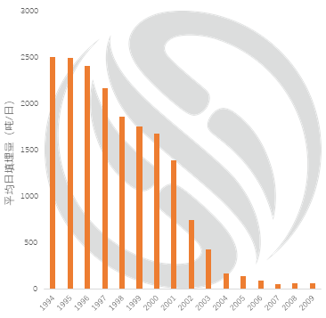 自垃圾分類收集與垃圾費隨袋收費政策相互結合后,在完善的獎懲機制配合下,臺北市的垃圾清運量變化明顯(如圖 1),填埋量也從最高每日2501噸,降至59噸,減量97.6%。到2010年,臺北市實現(xiàn)了垃圾零填埋的目標。
