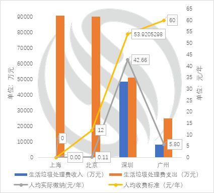 而在居民小區(qū)方面,北京市的收費力度較小,仍沿用1999年收費標準,常住居民3元/月/戶;外地來京人員2元/月/人,由物業(yè)代征或環(huán)衛(wèi)部門直接上門征收。而與廣州的情況類似,直接征收的方式收繳成本高,收繳率低,實際征收情況不佳,居民端垃圾處理的支出幾乎由財政完全承擔,與“污染者付費”的原則相悖。
