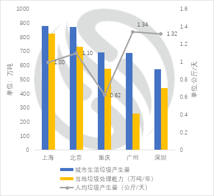 根據(jù)《2017年全國大、中城市固體廢物污染環(huán)境防治年報》,2016年我國城市生活垃圾產(chǎn)生量上海居首,北京次之??紤]到常住人口,人均生活垃圾產(chǎn)生量最大的城市為廣州,深圳次之??梢钥闯瞿戏匠鞘猩罾娜司a(chǎn)量相對較高,E20研究院認為這可能與不同地域人口飲食習慣不同存在關系。結合當年各城市實際處理能力來看,廣州缺口明顯,且人均垃圾產(chǎn)生量大,垃圾圍城形勢最為嚴峻。本文僅選取人均日均生活垃圾產(chǎn)生量在1公斤左右的四座一線城市:廣州、深圳、北京、上海進行分析。