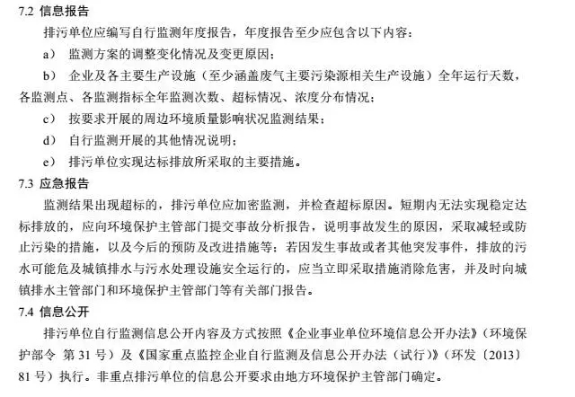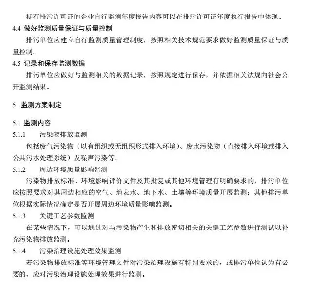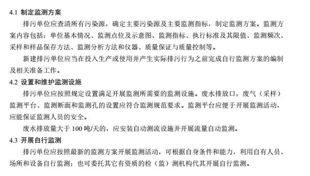 一是自行監(jiān)測的一般要求,即制定監(jiān)測方案、設置和維護監(jiān)測設施、開展自行監(jiān)測、做好監(jiān)測質量保證與質量控制、記錄保存和公開監(jiān)測數據的基本要求;
