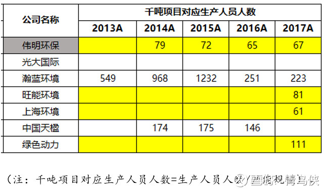 偉明環(huán)保的千噸項目所需生產(chǎn)人員僅僅67人,遠低于旺能環(huán)境的81人,綠色動力的111人,中國天楹由于一半營收來之設(shè)備銷售,因此即使去除一半人數(shù),千噸項目所需人員也在70-80之間。翰藍業(yè)務(wù)較多,單獨看綠電焚燒項目,大約有200號人。(上海環(huán)境偏少因為有部分派遣員工)