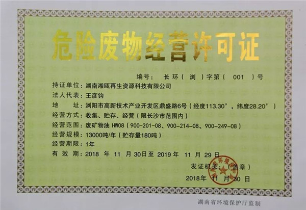 2018年11月15日,湖南湘甌再生資源科技有限公司向瀏陽市環(huán)保局申請發(fā)放廢礦物油危險廢物的收集許可證,申請年收集總量1.3萬噸。經(jīng)專家評審,公示公開,湖南湘甌再生資源科技有限公司選址符合相關(guān)要求,申請《危險廢物經(jīng)營許可證》材料齊全。按照《危險廢物經(jīng)營許可證管理辦法》等文件規(guī)定,該公司符合廢礦物油(HW08)收集許可證的申請條件。11月30日,瀏陽市環(huán)境保護(hù)局向湖南湘甌再生資源科技有限公司發(fā)放了瀏陽市第一本《危險廢物經(jīng)營許可證》。