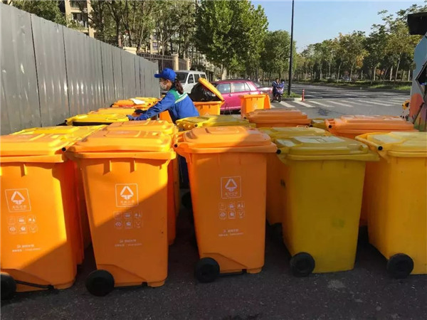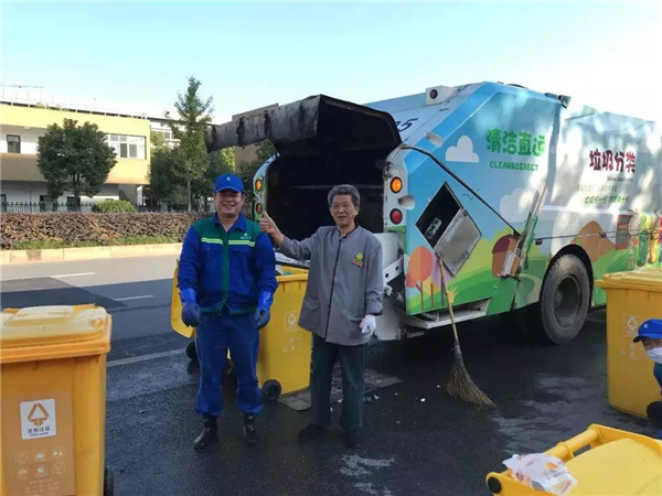 8點30分,龔磊來到了第三車的第一個作業(yè)點,丁橋陽光翡麗灣。這個時間點,上班的上班,上學(xué)的上學(xué)。小區(qū)保潔員過來把已經(jīng)清空的垃圾桶拖回小區(qū)集置點,保潔大伯不斷夸著這兩個年輕人干活利索,態(tài)度又好,非得跟龔磊來了一張難得的合影并豎起了大拇指,而龔縵琴害羞地躲開去拉桶了。