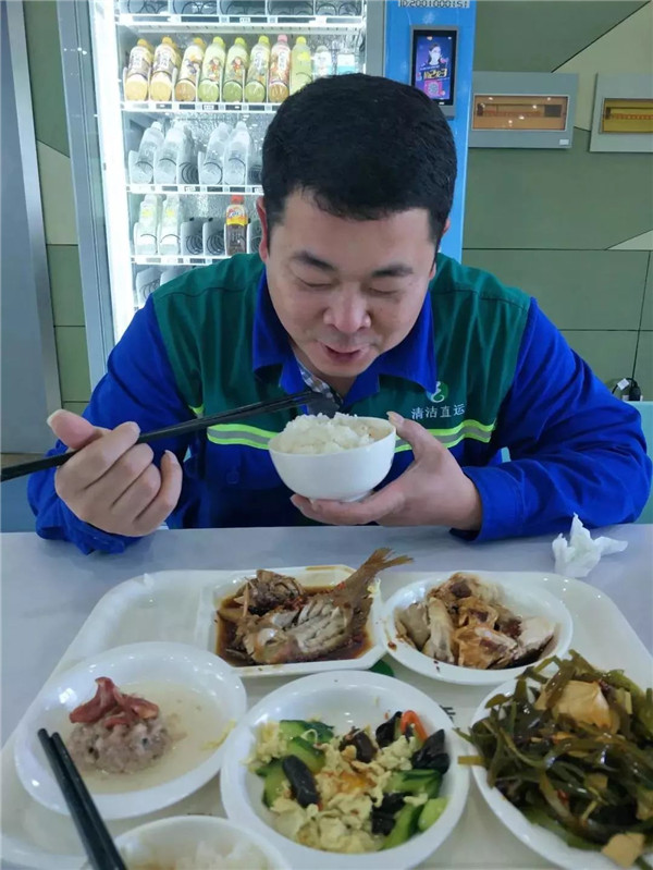 最后一車垃圾收運完成,龔磊將車輛開回了公司,清洗好并停放好已經(jīng)是12點了。在食堂挑選了喜歡的飯菜后,小兩口美美地在一起享用起來。