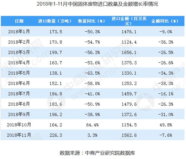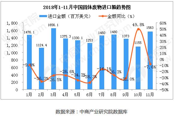從金額方面來(lái)看,2018年8-10月中國(guó)固體廢物進(jìn)口金額呈下降趨勢(shì),2018年11月中國(guó)固體廢物進(jìn)口金額有大幅度回升;2018年11月中國(guó)固體廢物進(jìn)口金額為1563百萬(wàn)美元,同比下降7.6%。