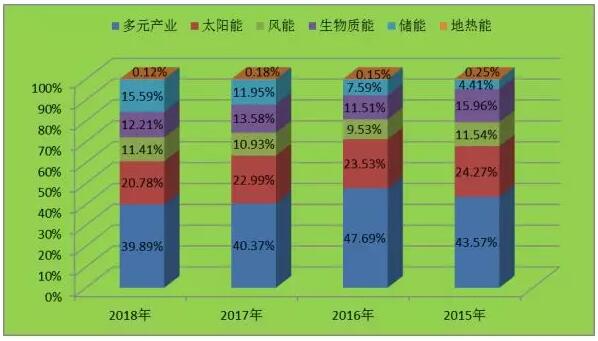 從收入規(guī)模來(lái)看,2018“500強(qiáng)”企業(yè)中從事太陽(yáng)能、生物質(zhì)能、儲(chǔ)能、風(fēng)能及多元產(chǎn)業(yè)企業(yè)的總營(yíng)業(yè)收入37008億元(2017:33905),占總營(yíng)業(yè)收入的99.88%(2017:99.82%)。其中,多元產(chǎn)業(yè)企業(yè)總營(yíng)業(yè)收入為14781億元(2017:13711)(見(jiàn)圖10),占總營(yíng)業(yè)收入的39.89%(2017:40.37%)(見(jiàn)圖11);太陽(yáng)能企業(yè)為7698億元(2017:7808),占總營(yíng)業(yè)收入的20.78%(2017:22.99%);生物質(zhì)能企業(yè)為4526億元(2017:4614),占12.21%(2017:13.58%);儲(chǔ)能電池企業(yè)為5777億元(2017:4060),占15.59%(2017:11.95%);風(fēng)能企業(yè)為4226億元(2017:3713),占11.41%(2017:10.93%);地?zé)崮芷髽I(yè)為45億元(2017:60),占0.12%(2017:0.18%)。