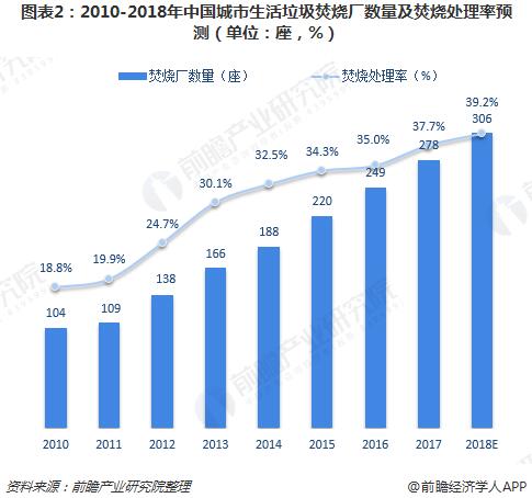 2017年,我國(guó)城市生活垃圾焚燒處理量已達(dá)到7589萬(wàn)噸,同比增長(zhǎng)2.86%;此外,焚燒垃圾場(chǎng)數(shù)量從2010年的104座增加至2017年的278座,焚燒處理率由2010年的18.8%提高至37.7%。