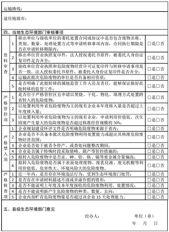 二、從嚴(yán)把控危險(xiǎn)廢物跨省轉(zhuǎn)入。各級(jí)生態(tài)環(huán)境部門要認(rèn)真貫徹《河北省固體廢物污染環(huán)境防治條例》,嚴(yán)格控制省外的危險(xiǎn)廢物轉(zhuǎn)移至我省行政區(qū)域內(nèi)貯存或者處置。要對(duì)照“河北省固體(危險(xiǎn))廢物跨省移入申請(qǐng)表”(附件),從嚴(yán)核查跨省轉(zhuǎn)入申請(qǐng)。