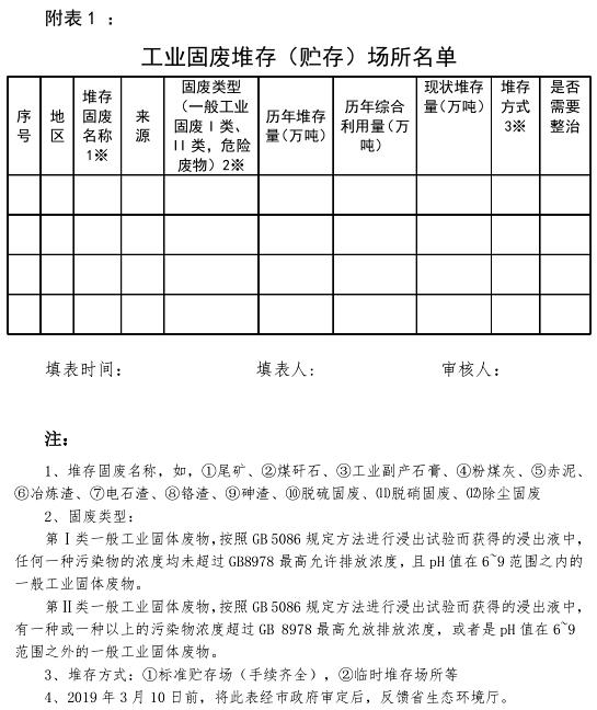 (一)全面排查階段(2019 年 2 月底前)。各市根據(jù)生態(tài)環(huán)境、發(fā)展改革、工業(yè)和信息化等部門提供的相關(guān)材料,詳細(xì)核查本轄區(qū)工業(yè)固體廢物的貯存場所和堆存場所,以縣(市、區(qū))為單位,列出轄區(qū)貯存場所和堆存場所名單(附表 1);對照相關(guān)標(biāo)準(zhǔn)進(jìn)行現(xiàn)場排查(附表 2、附表 3),篩選“三防”措施不到位,以及存在土壤和地下水污染隱患的問題堆場名單(附表 4)。2019年 3 月 10 日前,將附表 1 和附表 4 匯總情況,經(jīng)市政府審定后,反饋省生態(tài)環(huán)境廳。