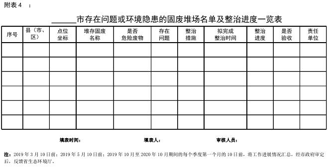 (二)制定整治方案階段(2019 年 4 月底前)。對排查發(fā)現(xiàn)存在問題和隱患的堆存場所,按照誰產(chǎn)生、誰治理的原則,由責(zé)任主體單位制定環(huán)境整治方案,完善“防揚(yáng)散、防流失、防滲漏”措施,并報(bào)所在地生態(tài)環(huán)境部門備案。無法找到責(zé)任單位的,由當(dāng)?shù)厝嗣裾?fù)責(zé)治理。根據(jù)整治方案完善附表 4 相關(guān)內(nèi)容,2019年 5 月 10 日前,經(jīng)市政府審定后,反饋省生態(tài)環(huán)境廳。
