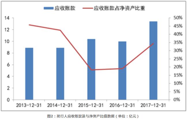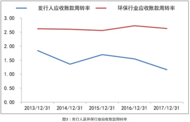 另一方面,從發(fā)行人違約前的近5年應(yīng)收賬款數(shù)據(jù)來看,如圖2所示,2013年到2017年,發(fā)行人的應(yīng)收賬款規(guī)模不斷增加,由8.91億元增長到了13.39億元,其與凈資產(chǎn)的比值在發(fā)行人戰(zhàn)略轉(zhuǎn)型前的2013-2015年區(qū)間不斷下降,但轉(zhuǎn)型后該比值卻一路上升,由2015年的18.37%增長到了2017年的34.40%;應(yīng)收賬款年周轉(zhuǎn)率2015年后也不斷下滑,從1.70降到了1.16,發(fā)行人的應(yīng)收賬款周轉(zhuǎn)率數(shù)據(jù)弱于環(huán)保行業(yè)整體水平。同時(shí),根據(jù)發(fā)行人2018半年報(bào)中數(shù)據(jù),截至2018年6月底發(fā)行人處于施工期BOT訂單11個(gè),未完成投資額37.72億元,尚未執(zhí)行的訂單27個(gè),擬投資金額為30.55億元,發(fā)行人未來的投資需求較大,資金壓力較大。