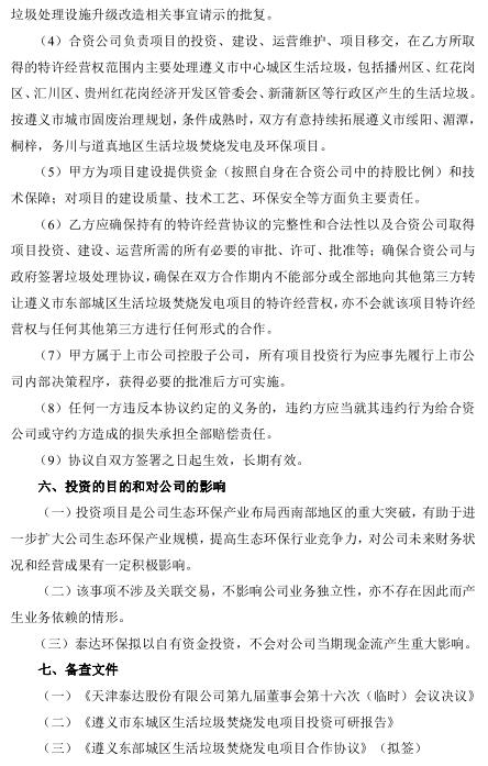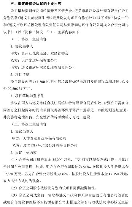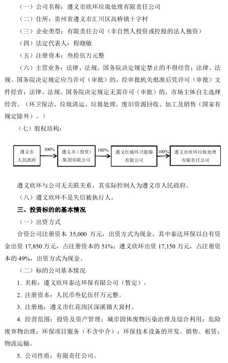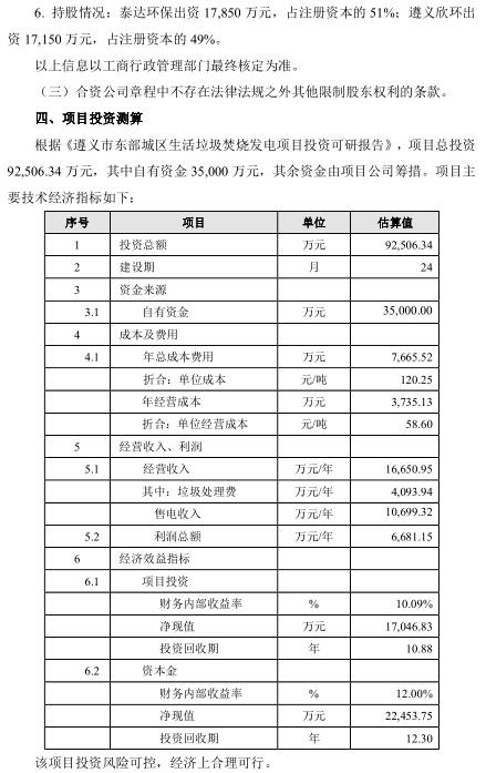 日前,泰達(dá)環(huán)保發(fā)布公告,公司控股子公司天津泰達(dá)環(huán)保有限公司(以下簡(jiǎn)稱“泰達(dá)環(huán)?!保M與遵義市欣環(huán)垃圾處理有限責(zé)任公司(以下簡(jiǎn)稱“遵義欣環(huán)”)組建合資公司共同投資建設(shè)遵義市東部城區(qū)生活垃圾焚燒發(fā)電項(xiàng)目(以下簡(jiǎn)稱“項(xiàng)目”)。項(xiàng)目選址紅花崗區(qū)深溪鎮(zhèn),占地面積約 147 畝,承擔(dān)遵義市中心城區(qū)生活垃圾處理任務(wù)。項(xiàng)目采用 PPP 模式中的 BOT 方式,特許經(jīng)營(yíng)期限為 30 年(含 2 年建設(shè)期),投資概算為 92,506.34 萬(wàn)元。合資公司負(fù)責(zé)建設(shè)處理規(guī)模為 1,500 噸/日(預(yù)留 750 噸/日)的生活垃圾焚燒發(fā)電項(xiàng)目和配套飛灰填埋場(chǎng)。合資公司注冊(cè)資本為 35,000 萬(wàn)元,股東方以現(xiàn)金方式出資,其中泰達(dá)環(huán)保出資 17,850 萬(wàn)元,占注冊(cè)資本的 51%;遵義欣環(huán)出資 17,150 萬(wàn)元,占注冊(cè)資本的 49%。