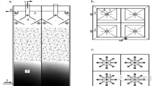 圖 2 UASB反應(yīng)器示意圖(a.剖視圖, b.頂視圖, c.底視圖; 1.進(jìn)水, 2.污泥層, 3.懸浮層, 4.三相分離器, 5.沉淀區(qū), 6.出水, 7.氣體)