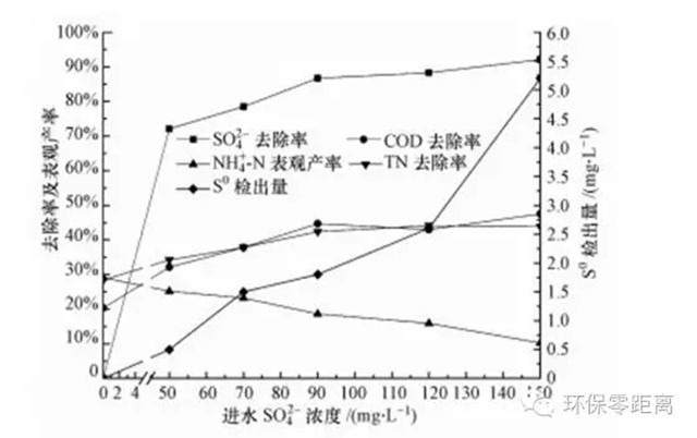 菌種鑒定確定了UASB反應(yīng)器內(nèi)存在硫酸鹽還原、脫硫反硝化和硝化反硝化, 而硫酸鹽還原反應(yīng)脫出的O可能被硝化菌及其它細(xì)菌撲捉參與硝化和有機(jī)物降解, 工藝運(yùn)行中也發(fā)現(xiàn), 隨著進(jìn)水SO42-含量的波動(dòng), UASB反應(yīng)器內(nèi)COD、TN、S2-等指標(biāo)也相應(yīng)存在細(xì)微的變動(dòng), 因此, 猜測(cè)硫酸鹽還原作用影響著硝化反硝化、脫硫反硝化及COD去除.為了試著驗(yàn)證這一猜想, 進(jìn)行了硫酸鹽含量對(duì)UASB運(yùn)行影響實(shí)驗(yàn).考慮到采用中試裝置研究會(huì)存在SO42-含量不易精確控制、藥劑投加量大和研究成本高等問(wèn)題, 因此, 采用小試研究.