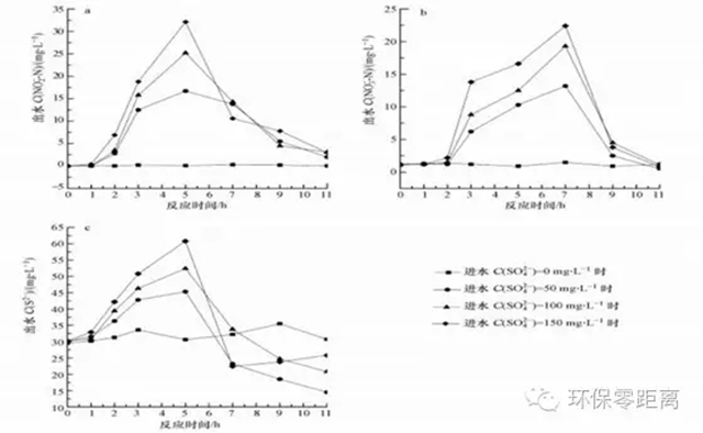 圖 7進(jìn)水C(SO42-)對(duì)UASB反應(yīng)咯呆全內(nèi)NO2--N、NO3--N、S2-指標(biāo)隨反應(yīng)時(shí)間變動(dòng)的影響