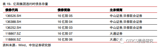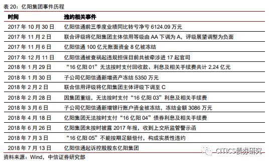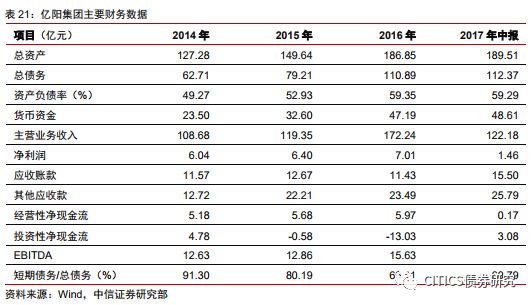(3)母弱子強,子公司盈利下滑觸發(fā)多只債券相繼違約。2017年中報中貨幣資金總額為48.6億元,其中17.4億元歸屬于上市子公司億陽信通,而負債主要集中在母公司。億陽信通前三季度業(yè)績同比虧損6124.09萬元,聯(lián)合評級下調(diào)其信用評級,外部融資進一步惡化。2018年年初“16億陽01”的實質(zhì)性違約,進一步暴露集團內(nèi)部流動性收縮以及外部融資渠道不暢等風險,此后三個季度內(nèi)相繼有4只債券違約。