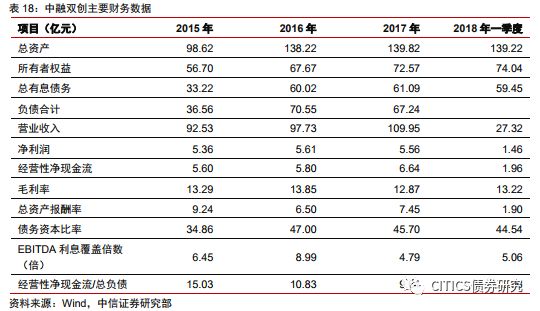 (2)資產(chǎn)規(guī)模擴張速度快,債務(wù)期限結(jié)構(gòu)不合理。2016年,公司投資活動現(xiàn)金流出13.54億元,主要用于固定資產(chǎn)等長期資產(chǎn)投資以及惠澤農(nóng)牧100%股權(quán)收購,負債總額為70.55億元,相比于2015年的35.56億元增長98.4%,大規(guī)模舉債對外投資加大了公司2016年的財務(wù)杠桿。2017年末,公司短期債務(wù)高達25.3億元,貨幣資金20.95億元,其中受限資金15.49億元,實際可用貨幣資金不足以覆蓋短期債務(wù),造成流動性缺口。此外,2018年以來信用債認購需求不足,使得企業(yè)再融資面臨一定壓力,對中融雙創(chuàng)信用環(huán)境產(chǎn)生較大影響。