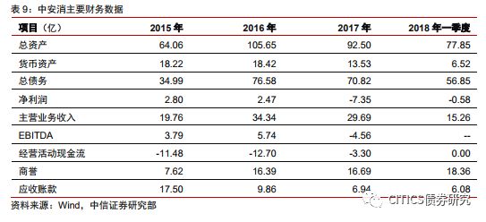 (2)負債驅(qū)動并購。中安消2015-2017年凈利潤為2.8億、2.5億、-7.4億,扣除非經(jīng)常損益后歸屬于母公司利潤同比增長27%、-82%、-2017%,中安消借殼上市置入資產(chǎn)經(jīng)營業(yè)績,在2015、2016年度均未達業(yè)績承諾,經(jīng)營質(zhì)量并沒有改善,公司自身運營并沒有明顯改善,靠發(fā)債補充公司流動資金。2015年12月,發(fā)行信用債“15中安消”,募集資金5億元,主要用于補充流動資金,截至2016年底,已使用49,600.00萬元用于補充公司流動資金。2016年11月份,發(fā)行“16中安消”募集資金11億元,截至2017年12月31日,已使用近4億元用于償還銀行借款及利息,近7億元用于補充公司流動資金。