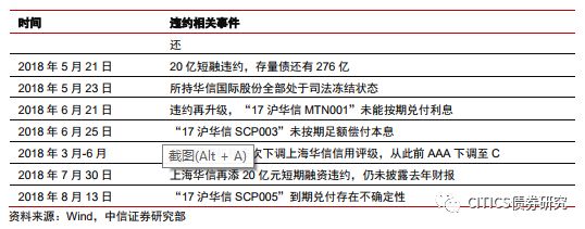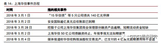上海華信是一家主要從事石油貿(mào)易的公司。經(jīng)過多次增資及股權(quán)變更,公司控股股東為中國華信,實際控制人為蘇衛(wèi)忠和鄭雄斌。2018年3月,受媒體新聞事件等不利因素的沖擊,多家評級機構(gòu)連續(xù)下調(diào)公司主體及債項信用等級,流動性資金短缺。2018年5月至今,相繼有4只債券(“17滬華信SCP002”、“17滬華信MTN001”、“17滬華信SCP003”、“17滬華信SCP004”)違約,違約金額高達85億元。