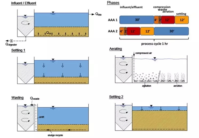 下圖是該系統(tǒng)的一個(gè)過(guò)程循環(huán)(小編個(gè)人認(rèn)為本質(zhì)就是個(gè)SBR系統(tǒng))時(shí)間通常約1小時(shí)。每個(gè)循環(huán)包括五個(gè)階段:進(jìn)水/出水(30分鐘)、壓縮、排泥、進(jìn)氣和靜置。出水由進(jìn)水驅(qū)動(dòng),而所有其他過(guò)程都是空氣驅(qū)動(dòng)的,包括曝氣和混合、氣浮排泥,氣封潷水等。曝氣有溶解氧控制,標(biāo)準(zhǔn)點(diǎn)設(shè)為1 mg /L。排泥時(shí)間視乎活性沉淀池中的實(shí)際污泥含量,并根據(jù)總固體濃度的在線測(cè)量數(shù)據(jù)作自動(dòng)調(diào)整。