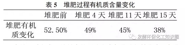 在堆肥過程中,堆料中的不穩(wěn)定有機物分解轉(zhuǎn)化為二氧化碳、水、礦物質(zhì)和穩(wěn)定化腐殖質(zhì),堆料的有機質(zhì)含量變化顯著。通常認為,堆肥過程中其有機質(zhì)含量的下降是堆肥腐熟的一個重要標志。在堆肥進行至第4天、第11天和第15天后,有機質(zhì)都有一定程度地降低,這是因為微生物在適宜的溫度范圍內(nèi)大量代謝活動,在噬溫菌和噬熱菌的作用下,大量有機物質(zhì)被分解,所以隨著堆肥的進行,有機質(zhì)都有一定程度地降低。