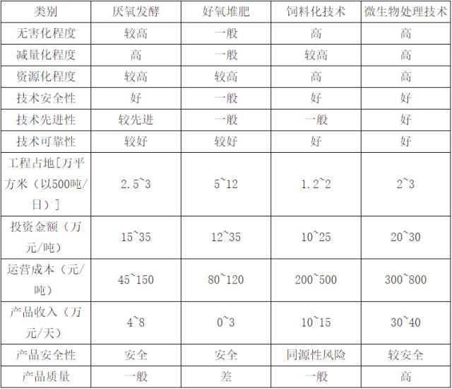 2)從經(jīng)濟(jì)效益比較,我們以日處理規(guī)模為500t計算,盡管資源化處理的費(fèi)用最高,但其總收益也最大,綜合來看年均收益能達(dá)到 1435 萬元。資源化處理方式又細(xì)分為厭氧發(fā)酵、好氧堆肥、直接烘干做飼料和微生物處理等。