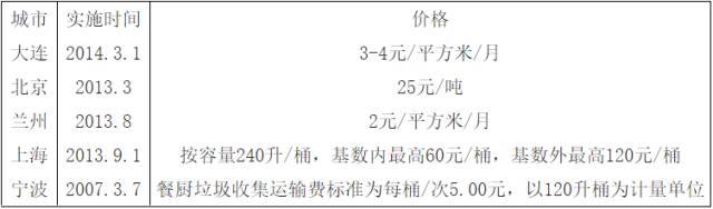 我國部分城市餐廚垃圾處理收費(fèi)標(biāo)準(zhǔn)