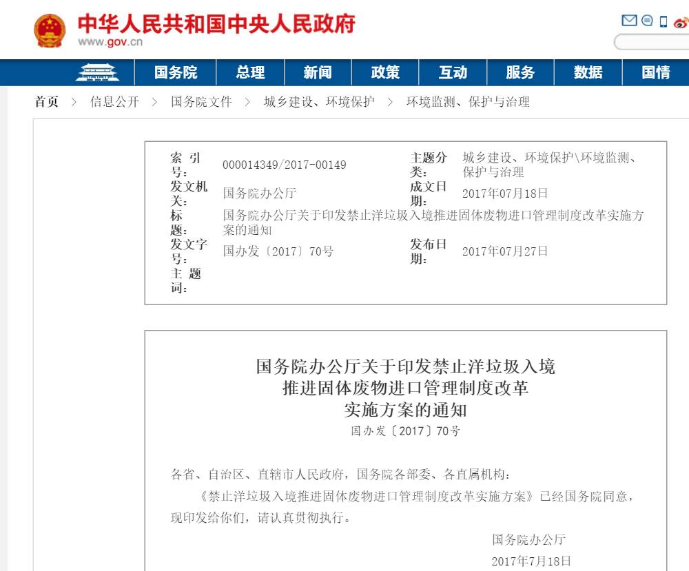 7月27日,國務(wù)院辦公廳正式發(fā)布禁止洋垃圾入境推進(jìn)固體廢物進(jìn)口管理制度改革實施方案。明確2017年年底前,全面禁止進(jìn)口環(huán)境危害大、群眾反映強(qiáng)烈的固體廢物;2019年年底前,逐步停止進(jìn)口國內(nèi)資源可以替代的固體廢物。