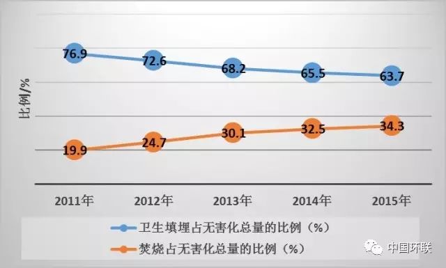 “十二五”期間縣城生活垃圾不同無(wú)害化技術(shù)處理比例,填埋比例一直穩(wěn)定在89%左右