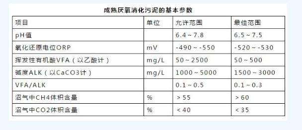 培養(yǎng)結(jié)束后,成熟的污泥呈深灰到黑色,有焦油氣味但無硫化氫氣味,pH值在7.0~7.5之間,污泥容易脫水和干化。對(duì)進(jìn)水的處理效果高,產(chǎn)氣量大,沼氣中甲烷成分高。培養(yǎng)成熟的厭氧消化污泥的基本指標(biāo)和參數(shù)見下表。