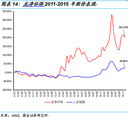 龍凈環(huán)保依靠其SCR煙氣脫硝技術(shù)將圓盤回旋混流技術(shù)與AIG氨噴射技術(shù)進(jìn)行有機(jī)結(jié)合,可保證氨/煙氣混合更加均勻;氨氣流量調(diào)節(jié)采用氣動薄膜單座直通式調(diào)節(jié)閥組來實(shí)現(xiàn),具有線性調(diào)節(jié)性好、反應(yīng)動作快、調(diào)節(jié)穩(wěn)定、密封性能好等優(yōu)點(diǎn),既可保證高脫硝率,又能準(zhǔn)確控制氨流量,保證氨逃逸率。采用該先進(jìn)技術(shù),可保證脫硝率達(dá)90%以上,氨逃逸<2.5ppm,SO2/SO3轉(zhuǎn)化率<1%。在2015年中電聯(lián)公布的簽訂合同的火電廠煙氣脫硝機(jī)組容量情況中,龍凈環(huán)保排名全國第二。隨著脫硝市場的快速釋放和業(yè)績的增加,公司股價從2011年初到2015年底上漲201.55%,跑贏上證指數(shù)175個百分點(diǎn),公司市值也由2011年初的71.5億增加至2015年底的185億。