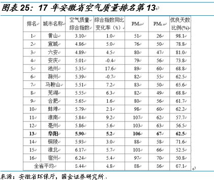 我們以阜陽市為例,2017年大氣污染防治工作考核不合格。2018年3月6日,安徽省政府辦公廳公布2017年度大氣污染防治工作考核結(jié)果。黃山市、合肥市為優(yōu)秀等次,池州市、阜陽市、淮南市、亳州市為不合格等次??己瞬缓细竦乃某鞘袑⒚媾R環(huán)評限批,即新增大氣污染物排放建設(shè)項(xiàng)目將被暫停審批。