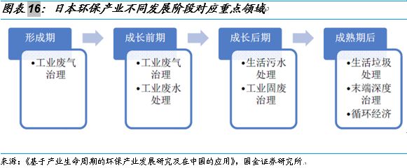 美國的環(huán)保行業(yè)在1990 年以后,末端治理領(lǐng)域產(chǎn)值增速放緩,資源回收領(lǐng)域逐漸發(fā)展; 2007 年開始,末端治理逐漸保持穩(wěn)定并開始出現(xiàn)下滑,新能源領(lǐng)域迅速發(fā)展,總體呈現(xiàn)明顯地周期擴(kuò)展趨勢。日本則是在公害事件后開始以工業(yè)污染治理為主的第一輪快速發(fā)展;在1990 年后,以環(huán)境基礎(chǔ)設(shè)施集中建設(shè)與升級為主要對象,實(shí)現(xiàn)了第二輪成長。在經(jīng)歷穩(wěn)定的成熟期后,環(huán)保產(chǎn)業(yè)發(fā)展重點(diǎn)逐步轉(zhuǎn)移至資源回收利用、綠色產(chǎn)品、氣候變化對策等領(lǐng)域,產(chǎn)業(yè)進(jìn)入外延擴(kuò)展的后成熟期。