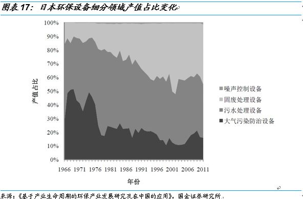 不同階段對應(yīng)不同細(xì)分領(lǐng)域結(jié)構(gòu)變化。日本環(huán)保設(shè)備細(xì)分領(lǐng)域產(chǎn)值占比中,污水處理設(shè)備、固體廢物處理設(shè)備、大氣污染防治設(shè)備一直占據(jù)并瓜分了90%以上的份額。其中,大氣領(lǐng)域在早期占比最多,而在經(jīng)歷了60-70 年代的高峰后占比逐年下滑,隨后污水領(lǐng)域成為最大主體,但自80 年代中后期也有所下降,相對地,固廢處理領(lǐng)域的占比則逐漸上升,在90 年代以后占據(jù)多數(shù)份額。細(xì)分領(lǐng)域的產(chǎn)值占比變化反映了日本環(huán)保產(chǎn)業(yè)內(nèi)部結(jié)構(gòu)性調(diào)整的大趨勢,這也與環(huán)境問題的治理階段相對應(yīng)。