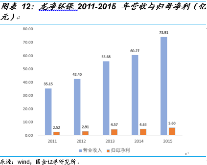 政策的大力支持帶動了火電脫硝機(jī)組的快速增長,全國煤電機(jī)組脫硝比重從2011年的9.80%快速增長到了2015年的95%。與此同時,脫硝機(jī)組的改造帶動了相應(yīng)市場需求的快速釋放,從事大氣污染控制領(lǐng)域的上市公司龍凈環(huán)保的營業(yè)收入和歸母凈利從2011年的35.15億和2.52億,快速增長到了2015年的73.91億和5.60億,復(fù)合增長率分別達(dá)到了20.42%和22.10%。