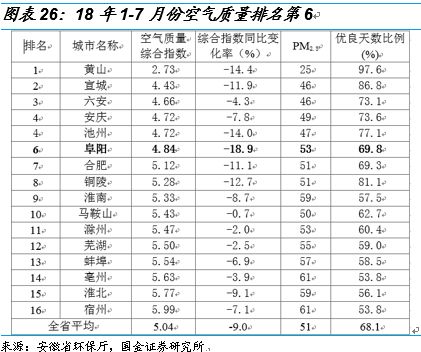 截至8月14日,阜陽市空氣質(zhì)量綜合指數(shù)由去年同期的第13名上升至第6名;PM2.5平均濃度51微克/立方米,較去年同期下降25.0%,降幅居全省第2位;優(yōu)良天數(shù)156天,同比增加27天。在生態(tài)環(huán)境部發(fā)布的2018年上半年全國空氣質(zhì)量狀況通報中,阜陽空氣質(zhì)量改善幅度居全國169個城市第5位。
