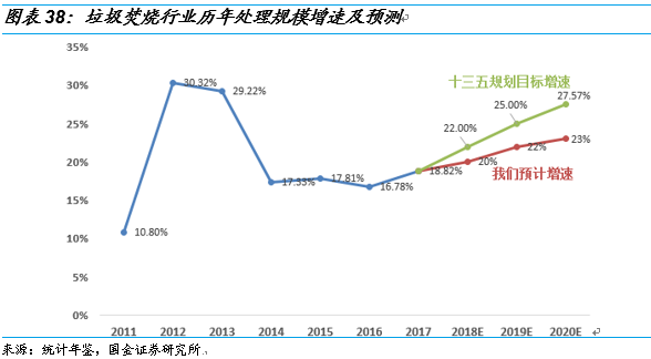 其次,雖然我國垃圾焚燒處理率提高迅速,但跟規(guī)劃仍有較大差距。我國的垃圾焚燒行業(yè)在“十二五”經(jīng)歷了快速增長,垃圾焚燒處理率從2011年的18%迅速提升到了2016年的38%?!丁笆濉比珖擎?zhèn)生活垃圾無害化處理設(shè)施建設(shè)規(guī)劃》提出,“十三五”期間,全國規(guī)劃新增生活垃圾無害化處理能力50.97萬噸/日(包含“十二五”續(xù)建12.9 萬噸/日),其中垃圾焚燒處理設(shè)施規(guī)模2020年要達(dá)到59.14萬噸/日。2017年的總處理能力達(dá)到30.4萬噸/日,要完成2020年的目標(biāo),2018-2020三年的行業(yè)復(fù)合增長率要達(dá)到24.83%。根據(jù)行業(yè)歷年增速及現(xiàn)有公司在建及籌建規(guī)模,我們預(yù)計2018-2020年行業(yè)增速分別是20%、22%和23%。